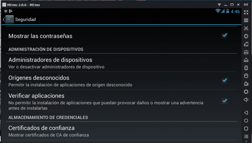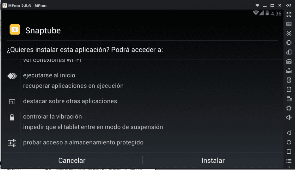Debes tener en cuenta que la configuración por defecto que nos ofrece el emulador, es con esta opción habilitada, pero si en cualquier caso has deshabilitado la opción de la instalación de aplicaciones de origen desconocido, tendrás que habilitarla nuevamente cuando quieras utilizar SnapTube, porque de lo contrario no podrás instalar la APK.