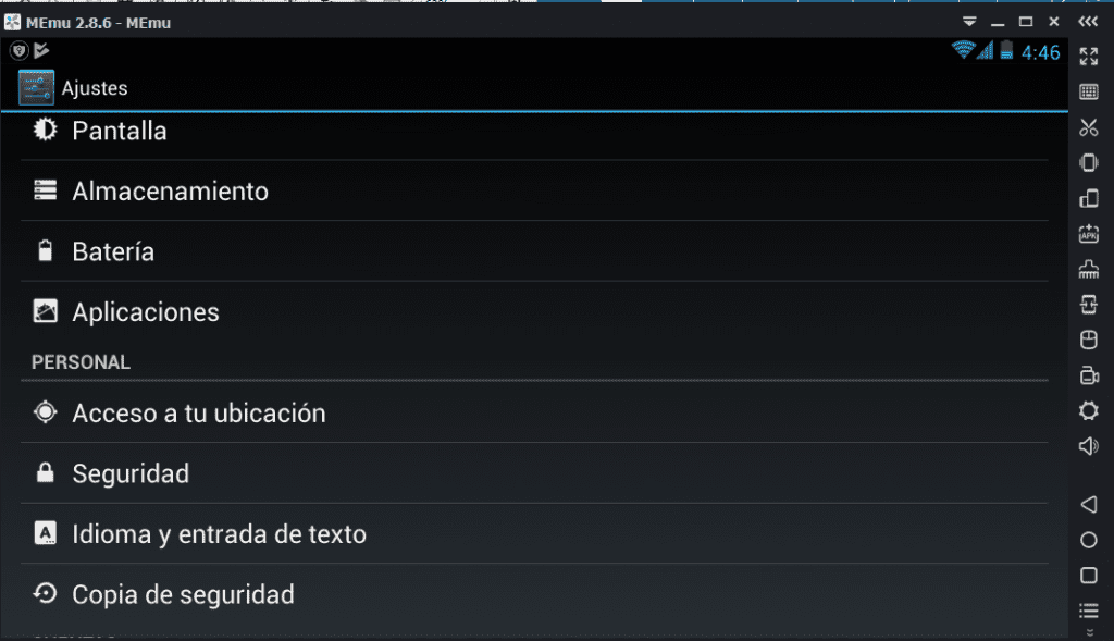 Al igual que un dispositivo Android normal, el emulador también debe estar configurado adecuadamente para permitir la instalación de las aplicaciones que no provienen desde la Google Play Store. Y es por esto que tendremos que ir a: