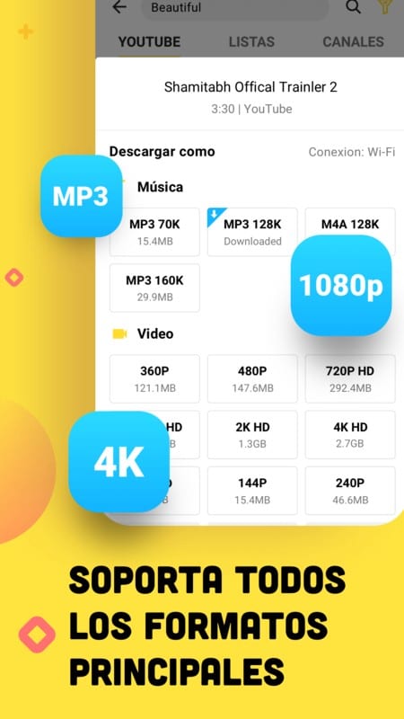 Puedes descargar vídeos en varias resoluciones, como 144p, 240p, 360p, 480p, 720p HD, 1080p HD, 2k HD, e incluso 4K. (Si instalas la versión beta). También puedes eliminar el audio del archivo de vídeo que ya has descargado y convertirlo en un archivo de música MP3 o M4A.